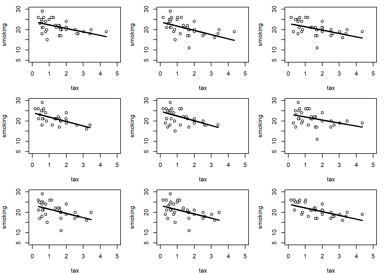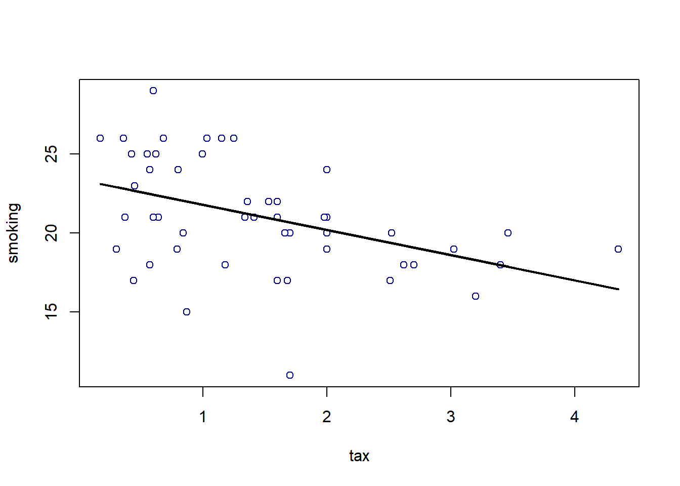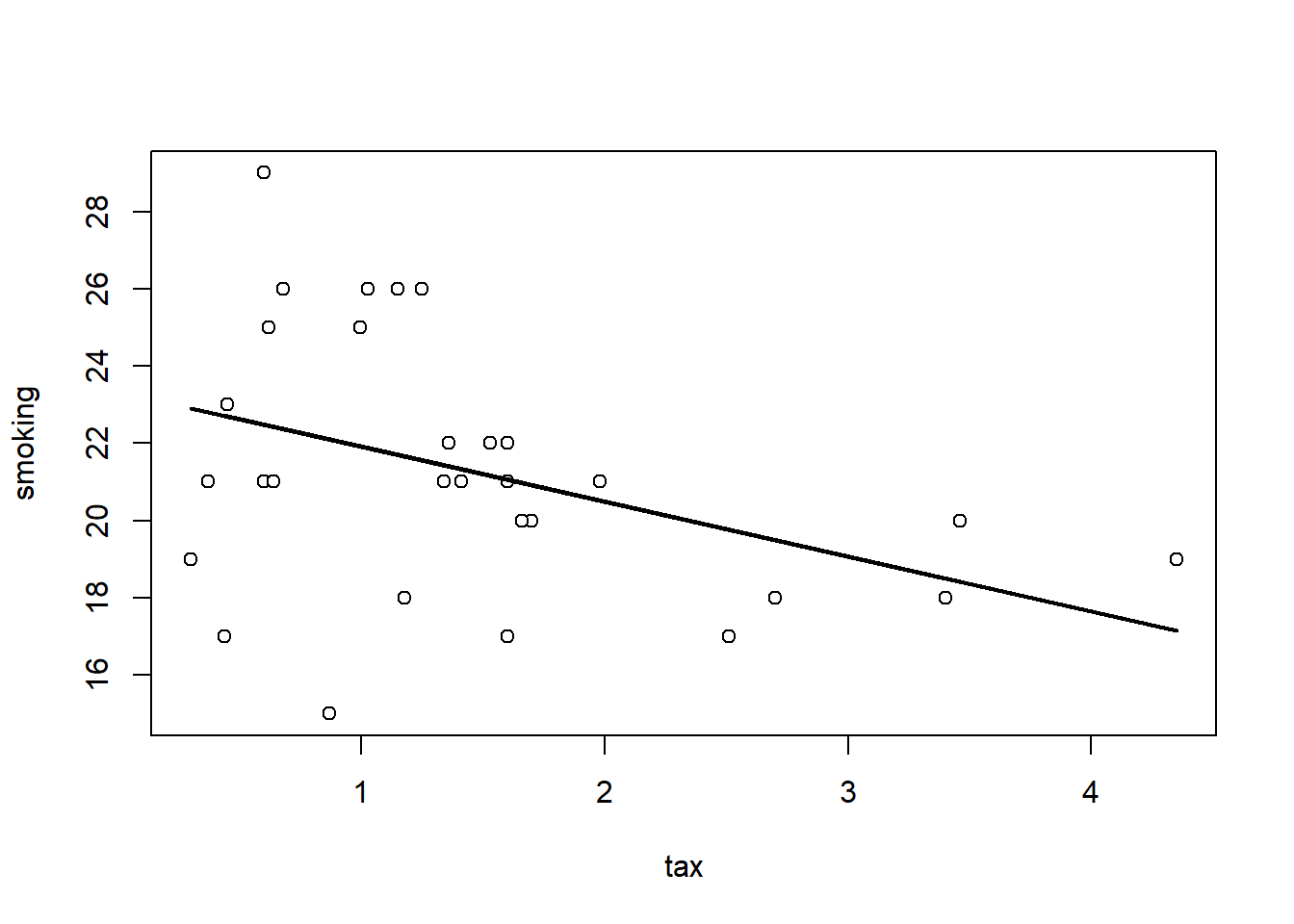 - Null Hypothesis \(H_0\) is that the slope of the true population line is zero. That is, there is no effect of cigarette tax on smoking.