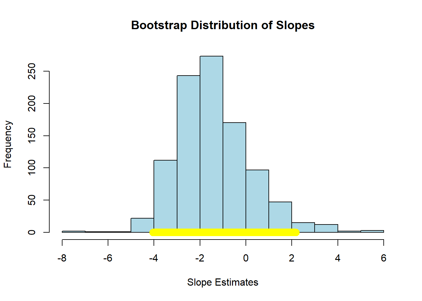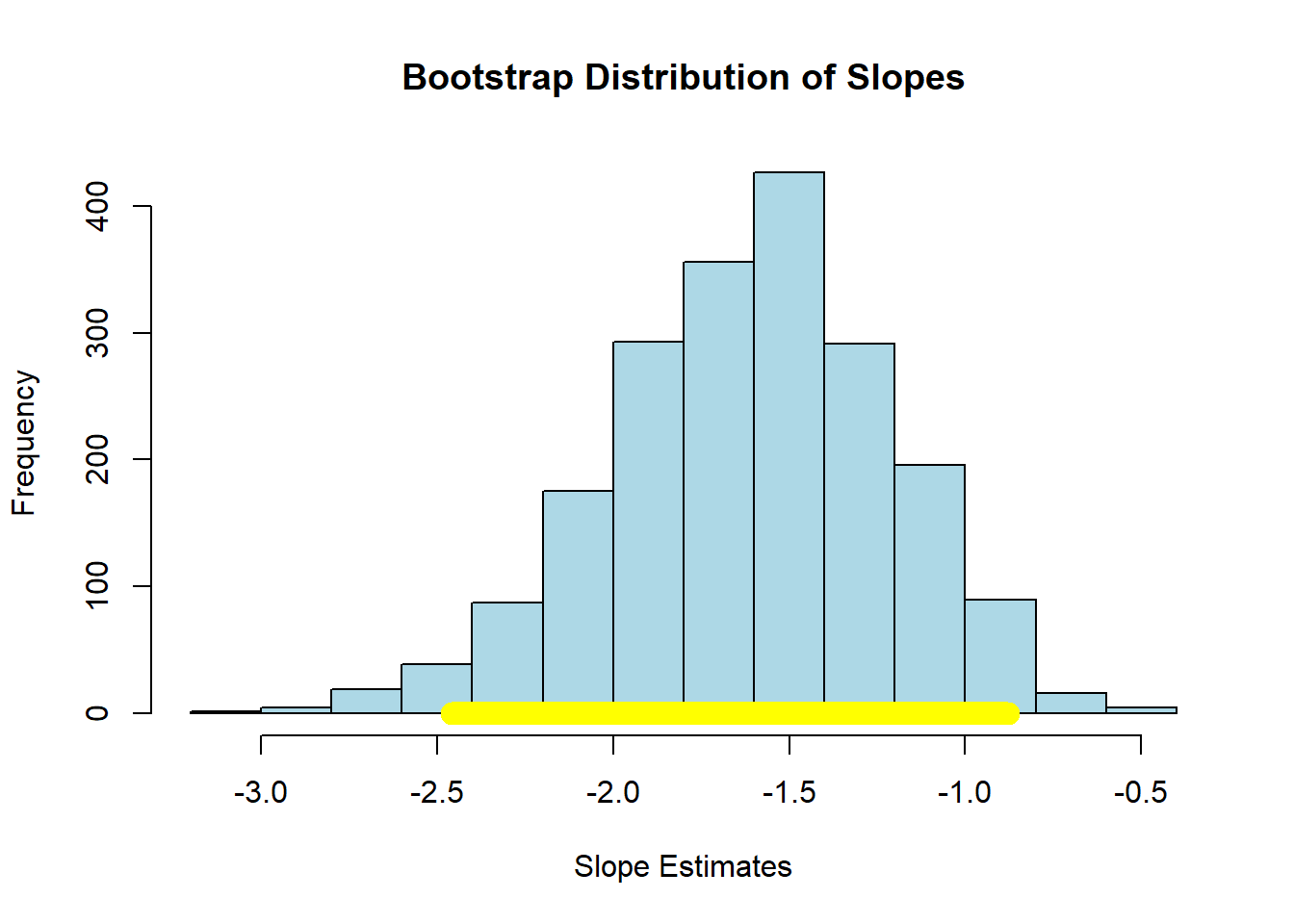 hist(slopes, col = "lightblue", border = "black", main = "Bootstrap Distribution of Slopes",