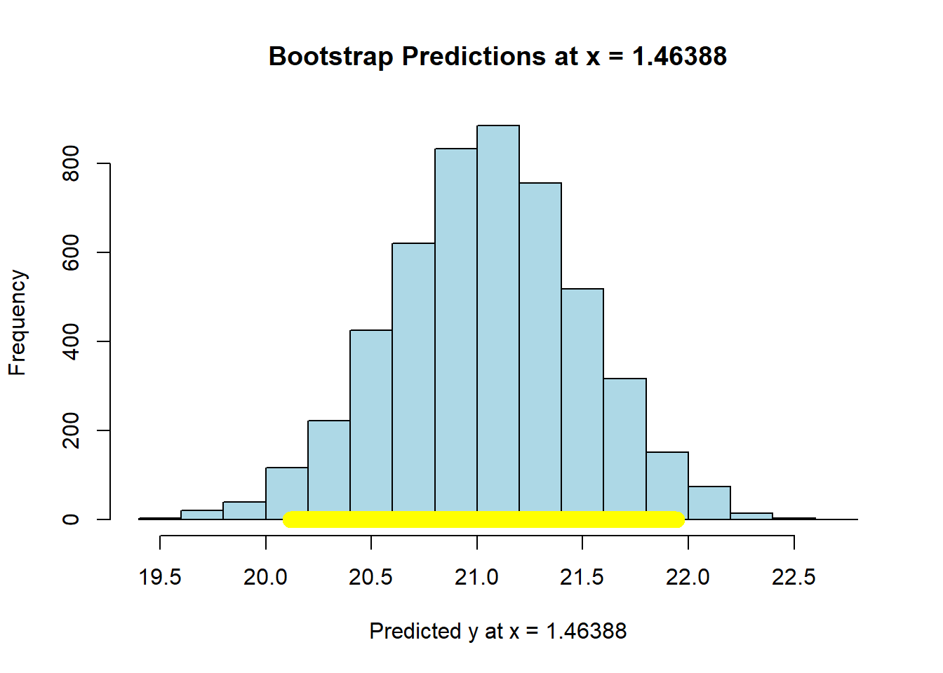 In any case, we can use our basic bootstrap procedure to produce thousands of predictions of the average value of \(Y\) for a given value of \(X\), and then plot the sampling distribution and confidence intervals for those predictions. Here is a function to help us: