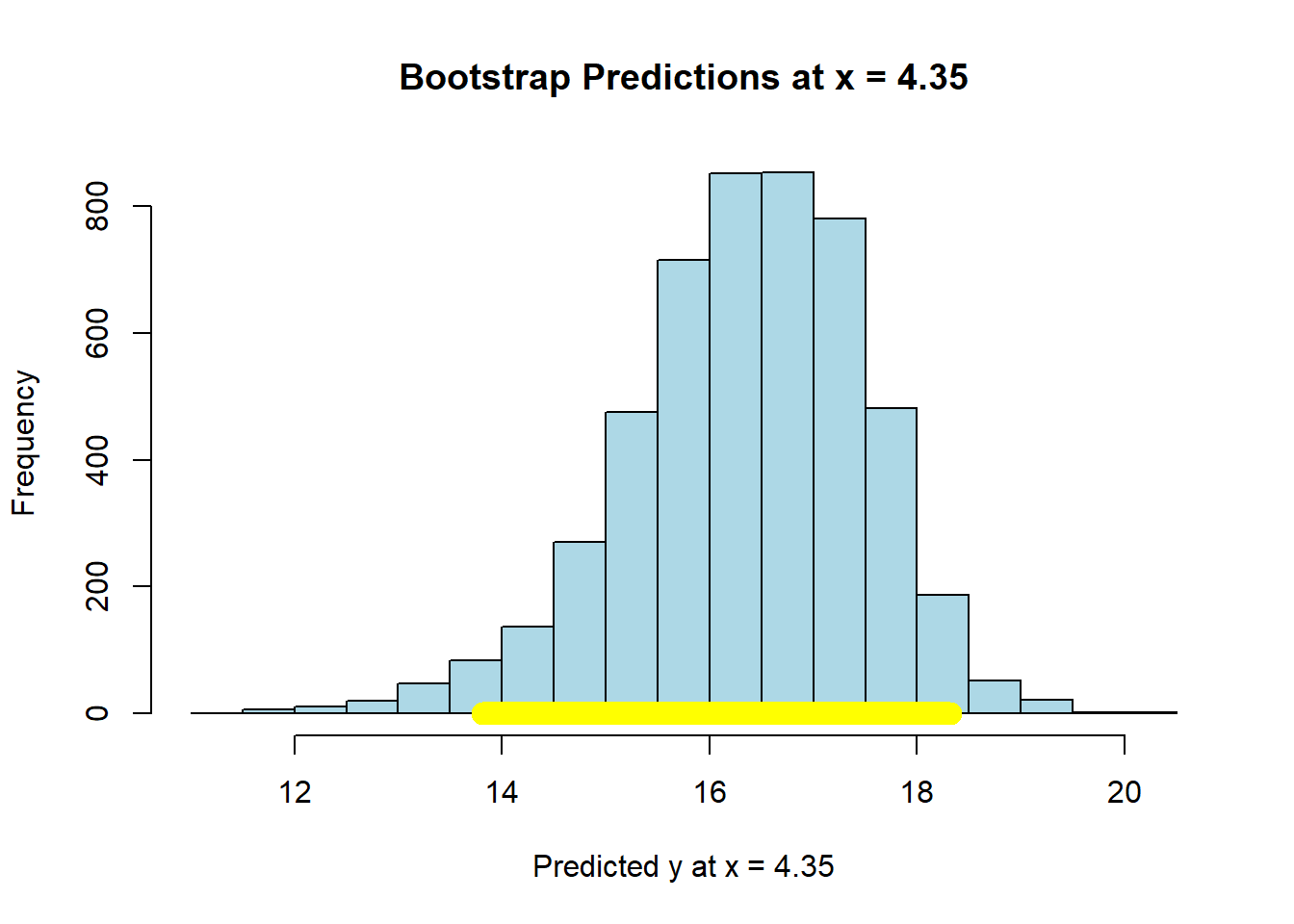 In practice, bootstrapping everything can be a little laborious for some problems. Fortunately, we can use the predict function in R for such cases. First, let’s fit our regression model “as usual”
