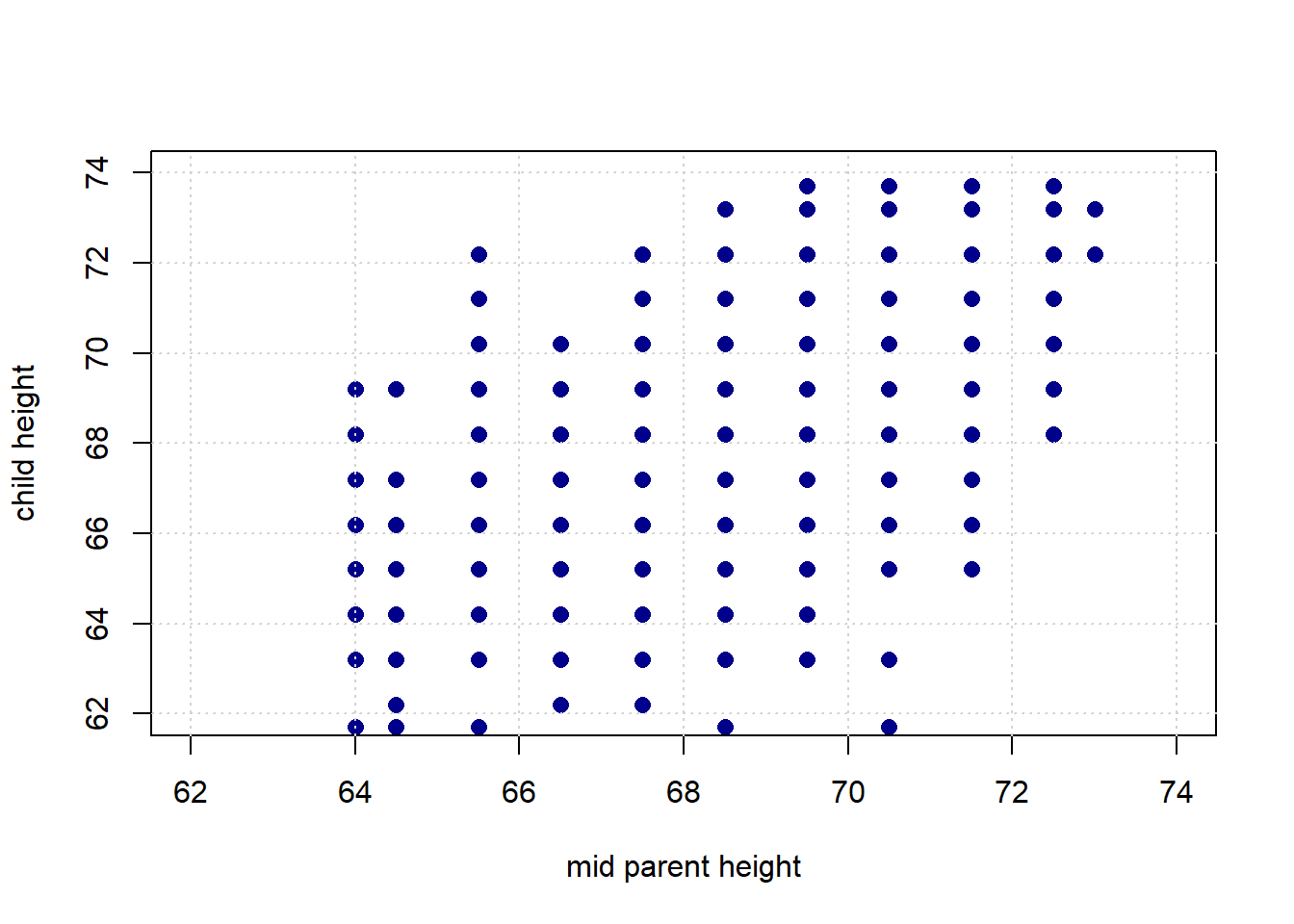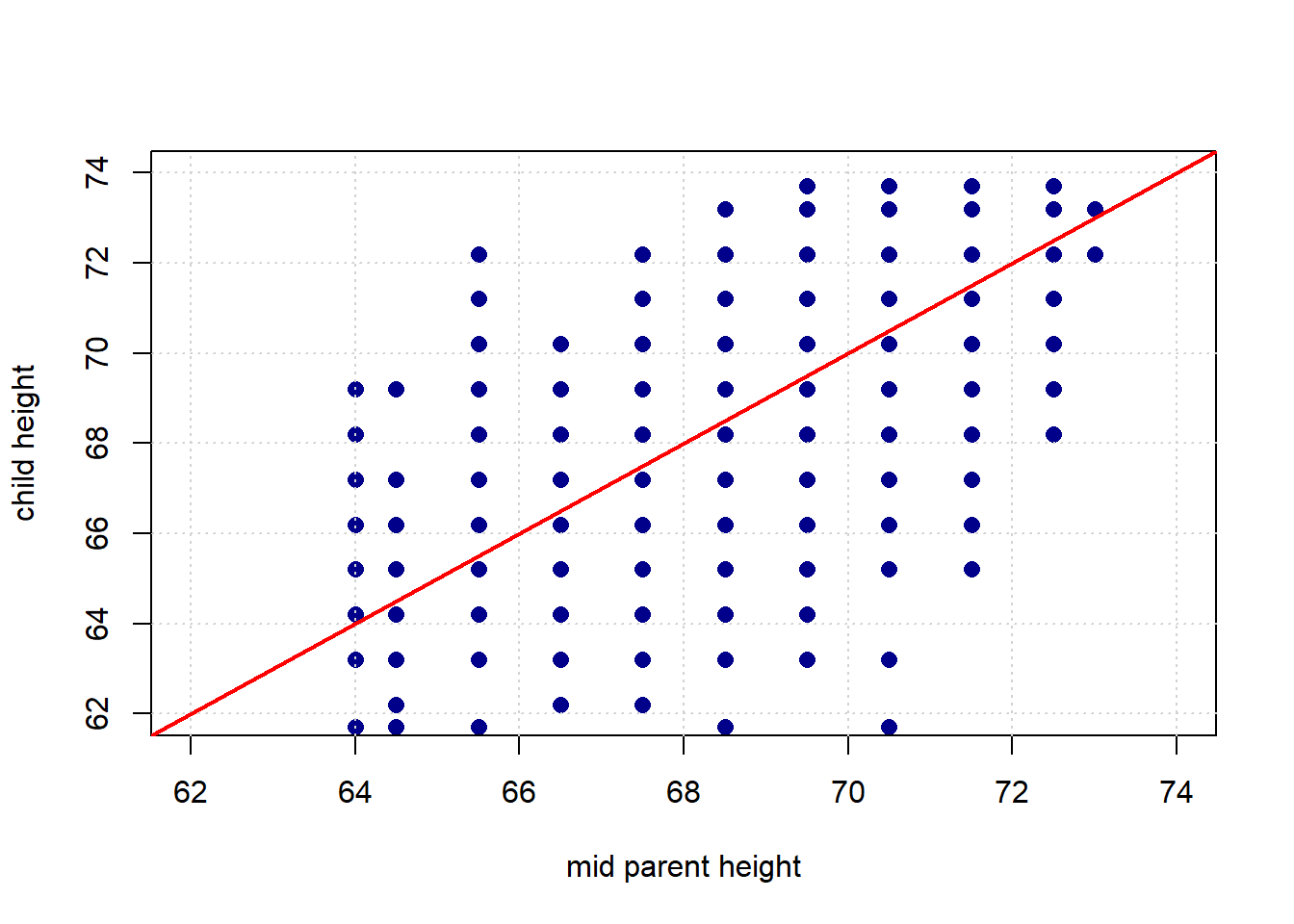 Galton’s theory was that the mid-parent height (essentially the mean of the mother’s and father’s height with an adjustment for the sex of the child) should be a excellent predictor of the child’s height. In particular, he assumed that the latter would be exactly proportional to the former. In other words: taller parents would have taller children, and every inch of extra parent height would add an extra inch to the child’s height.