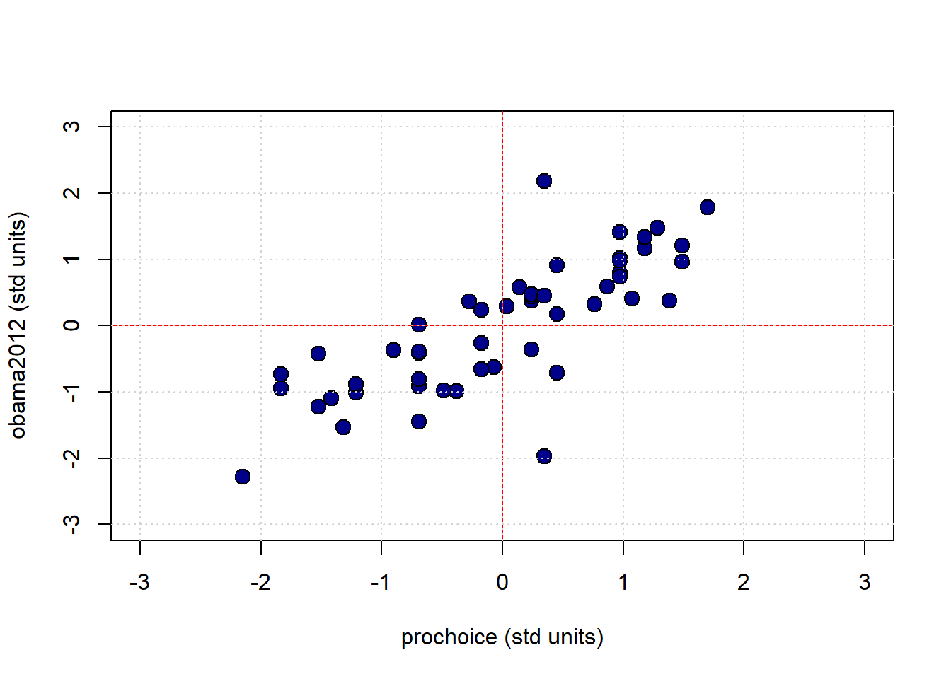 xlab="prochoice (std units)", ylab="obama2012 (std units)",