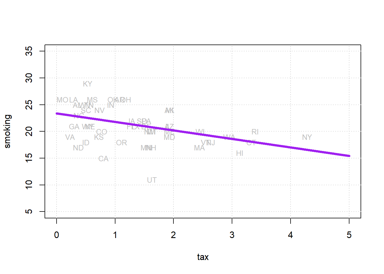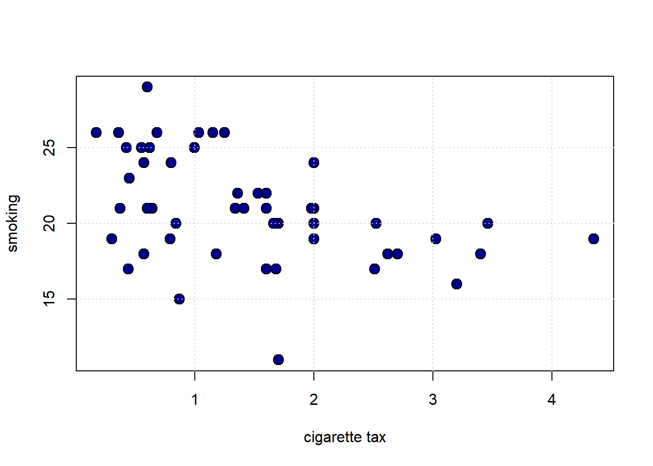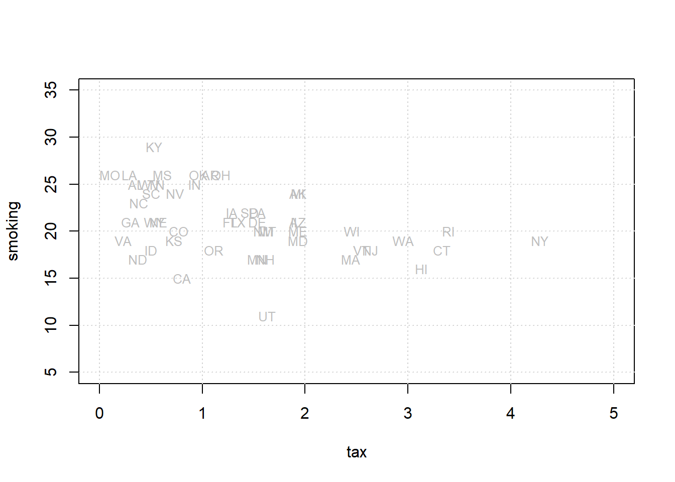 pch = 16, col = "gray", xlab = "Cigarette Tax",