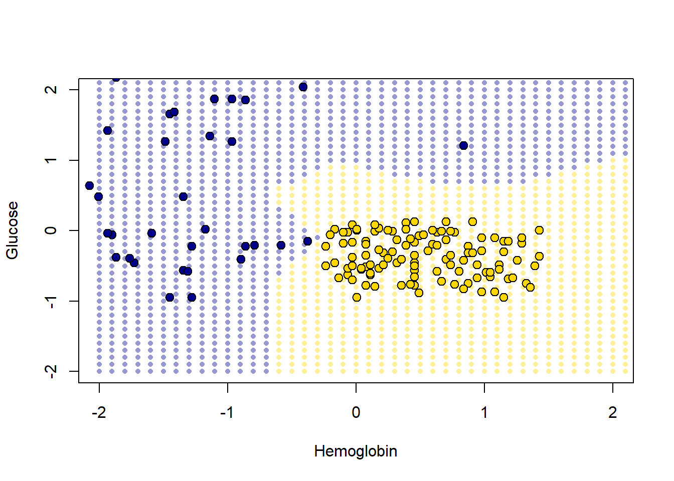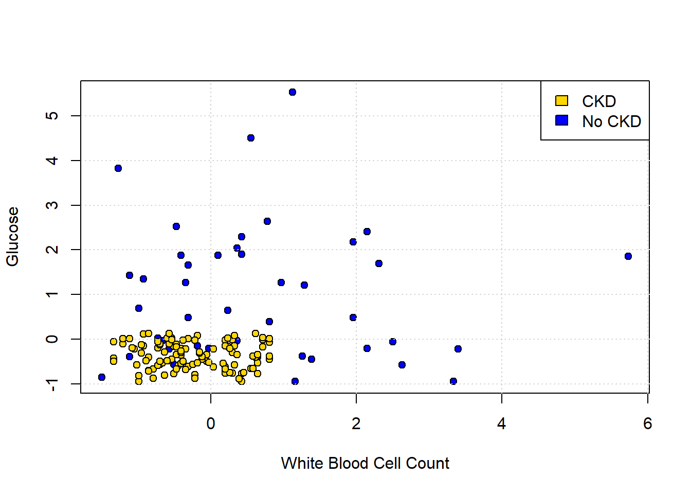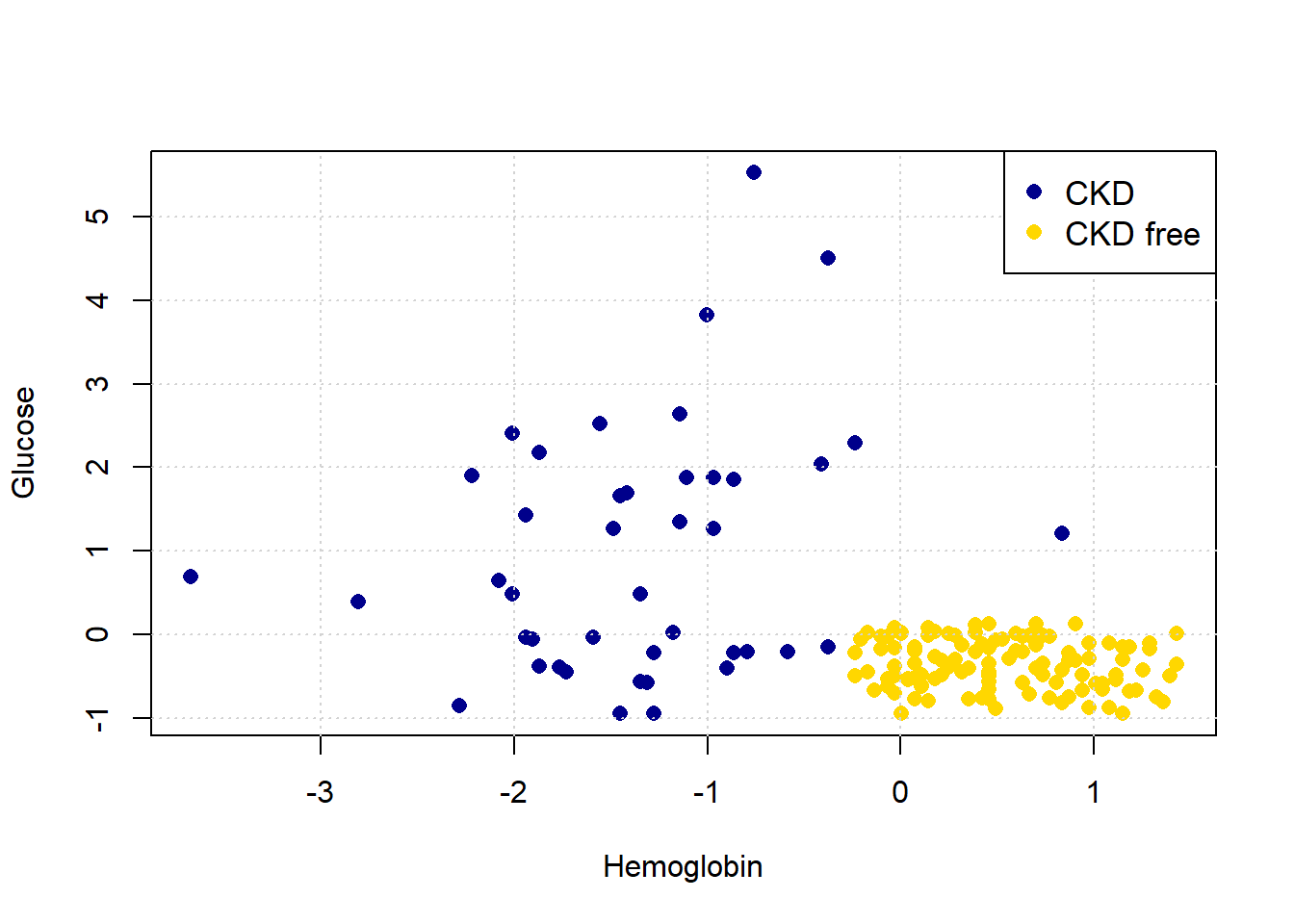 Looking at the plot, it seems that those with “high” Hemoglobin and “low” Glucose are CKD free. Meanwhile, other combinations of those variables seem to be associated with getting CKD.