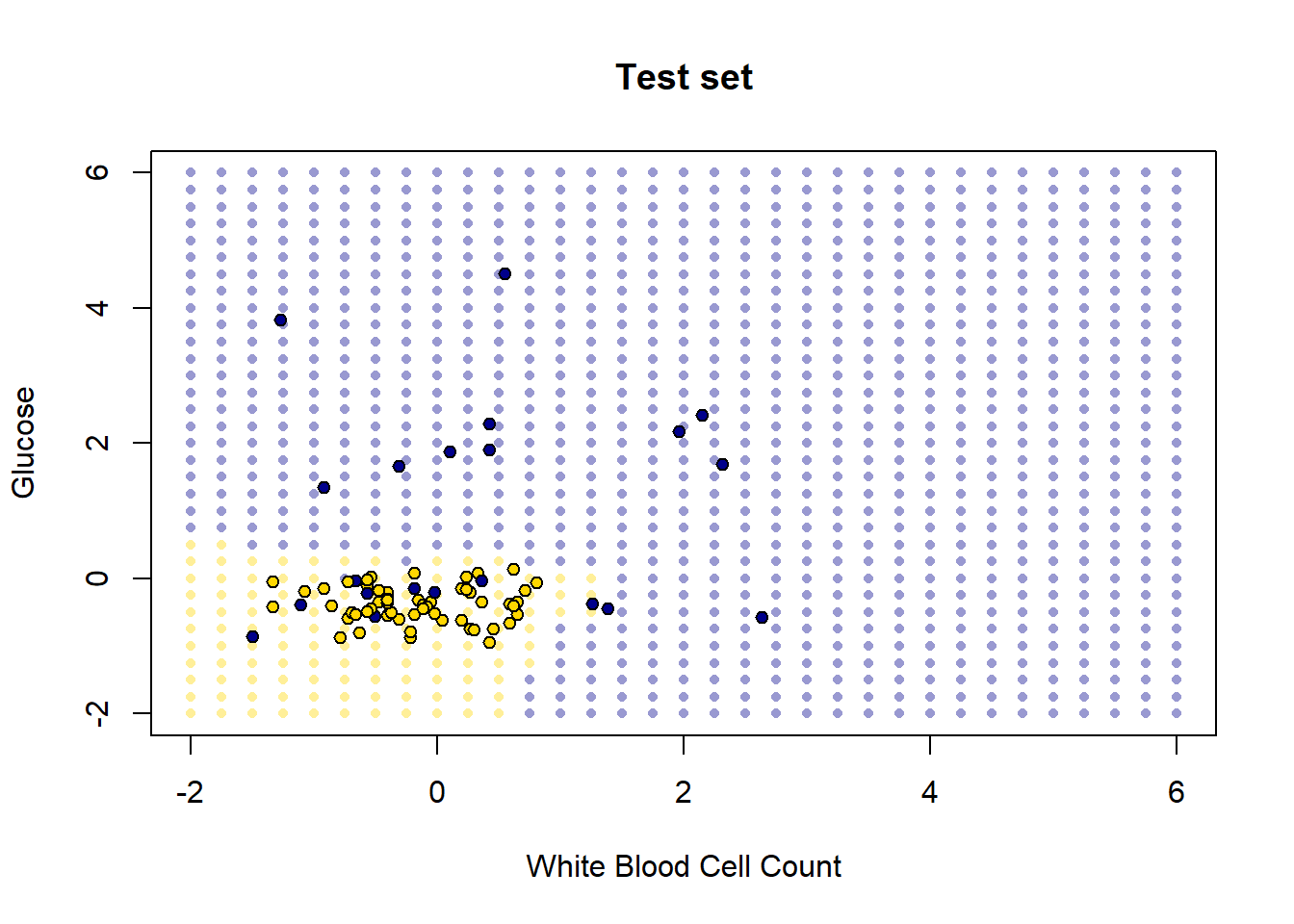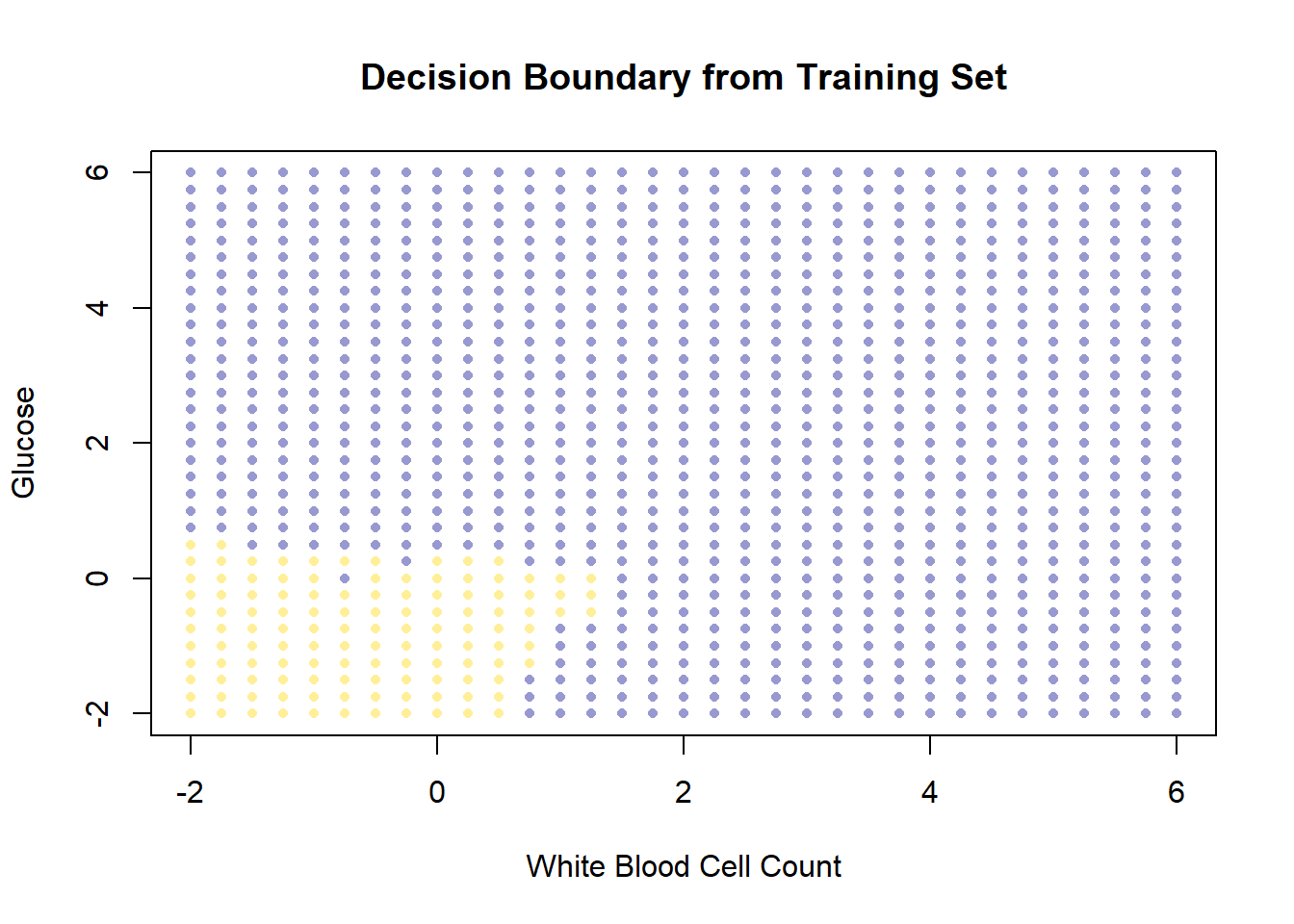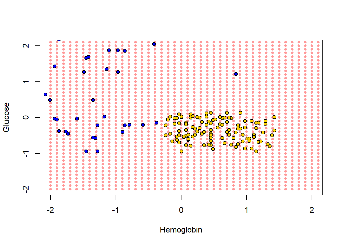 Looking at the plot, it seems that those with “high” Hemoglobin and “low” Glucose are CKD free. Meanwhile, other combinations of those variables seem to be associated with getting CKD.