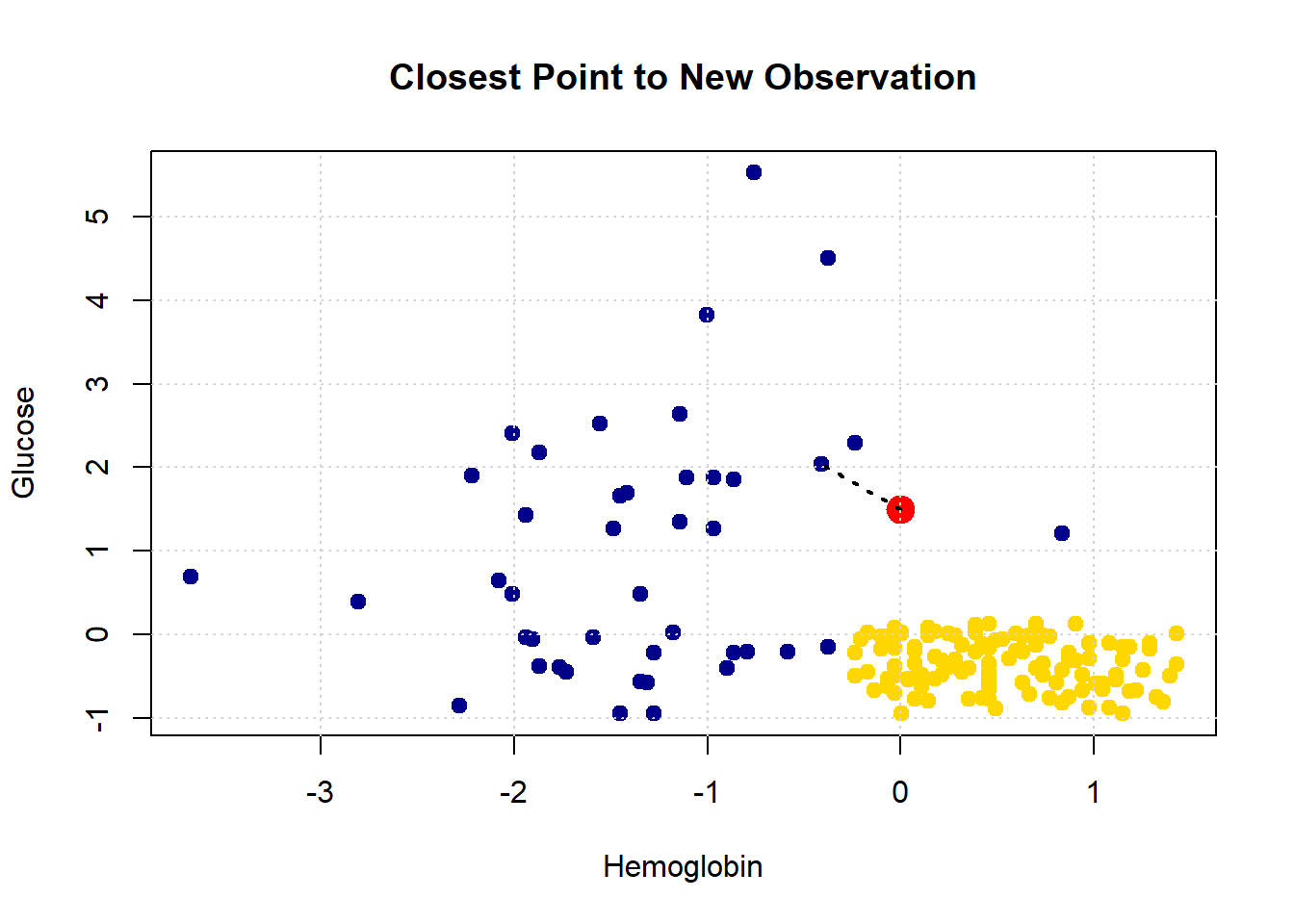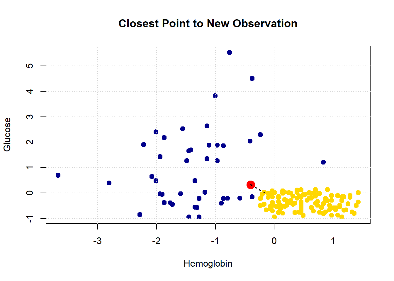 - look at the new patient’s attributes (Hemoglobin, Glucose)