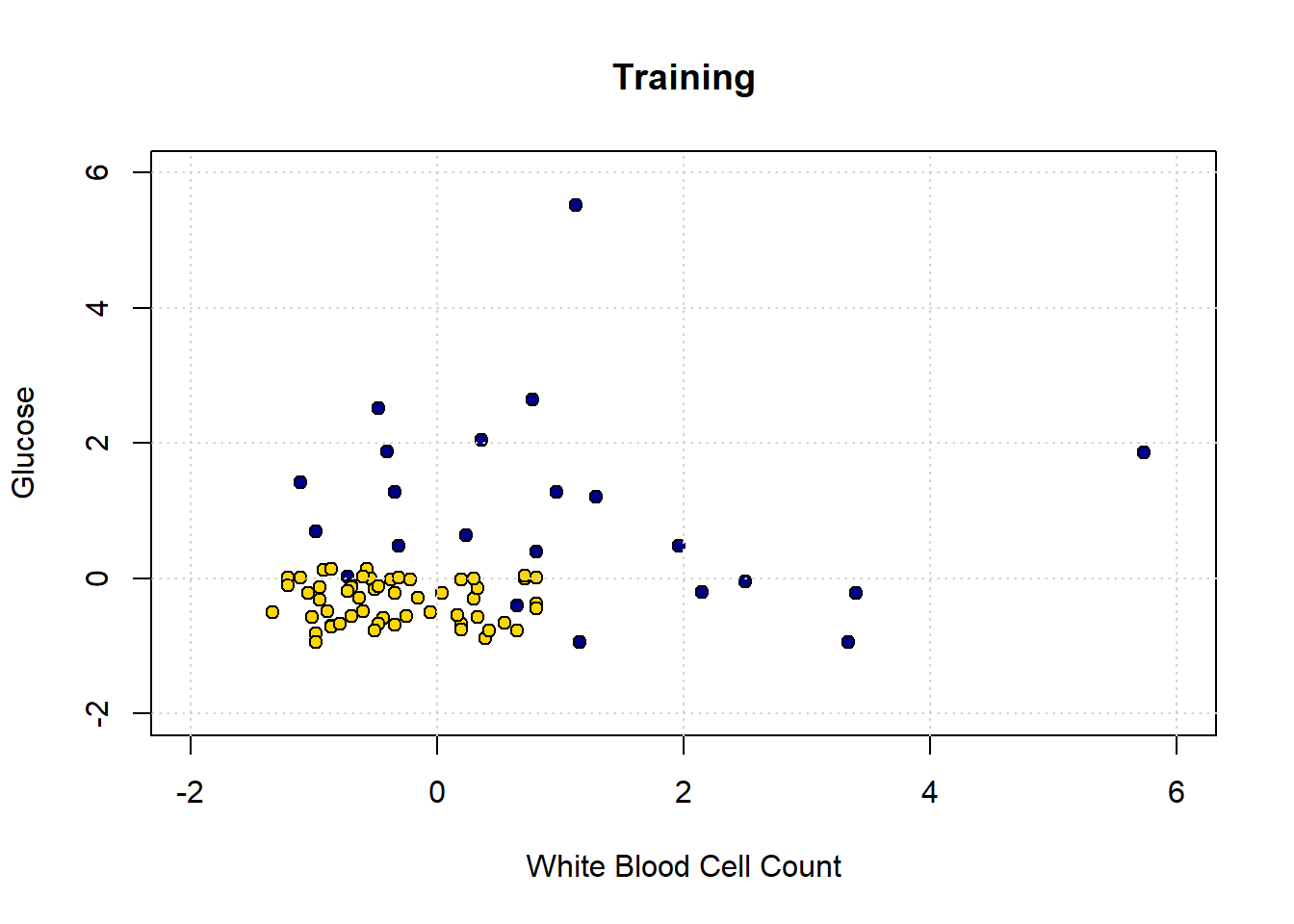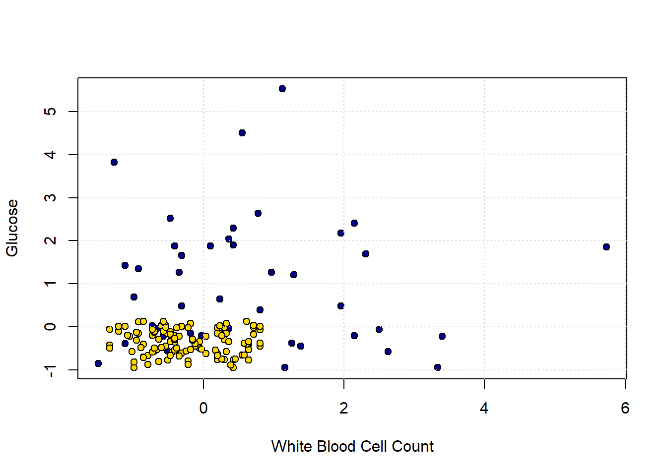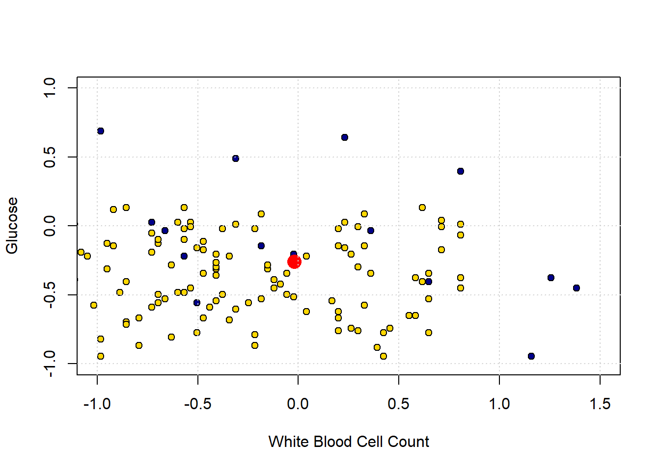 Before we start building a classifier, note that it is typical in machine learning problems like the one we are about tackle to standardize our variables prior to using them for prediction. The basic reason for this is to avoid the scale on which a variable is measured affecting its importance in classification. To understand this point, note that our technique below will ask how “far” one observation is from another. If we don’t standardize the variables, the ones that happen to have averages that are bigger (raw) numbers (e.g. the patient’s height in inches) will overwhelm those measured with smaller (raw) numbers (e.g. the patient’s number of previous surgeries). Yet presumably it is patients relative positions on these things that are most useful for predicting outcomes.