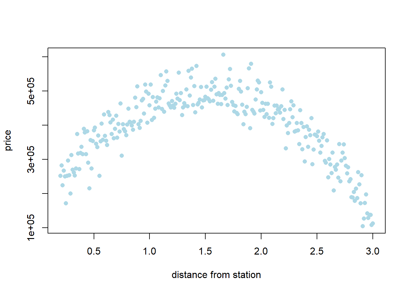 To get a sense of this, let’s make a toy data set. We will have a \(Y\) variable which is the sales price of houses again, but this time our (one) \(X\) variable is distance to the nearest train station. In general, we anticipate that being near the train station leads to a higher price (because people commute). But as we get very close to the train station, we expect prices to decline. This is because public transit stops can be noisy, attract traffic etc.