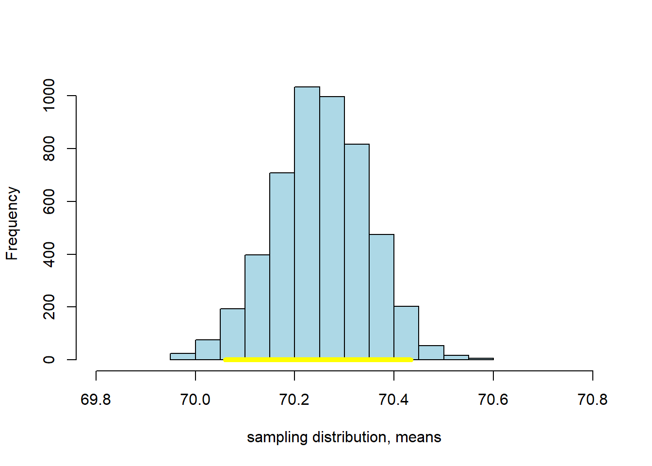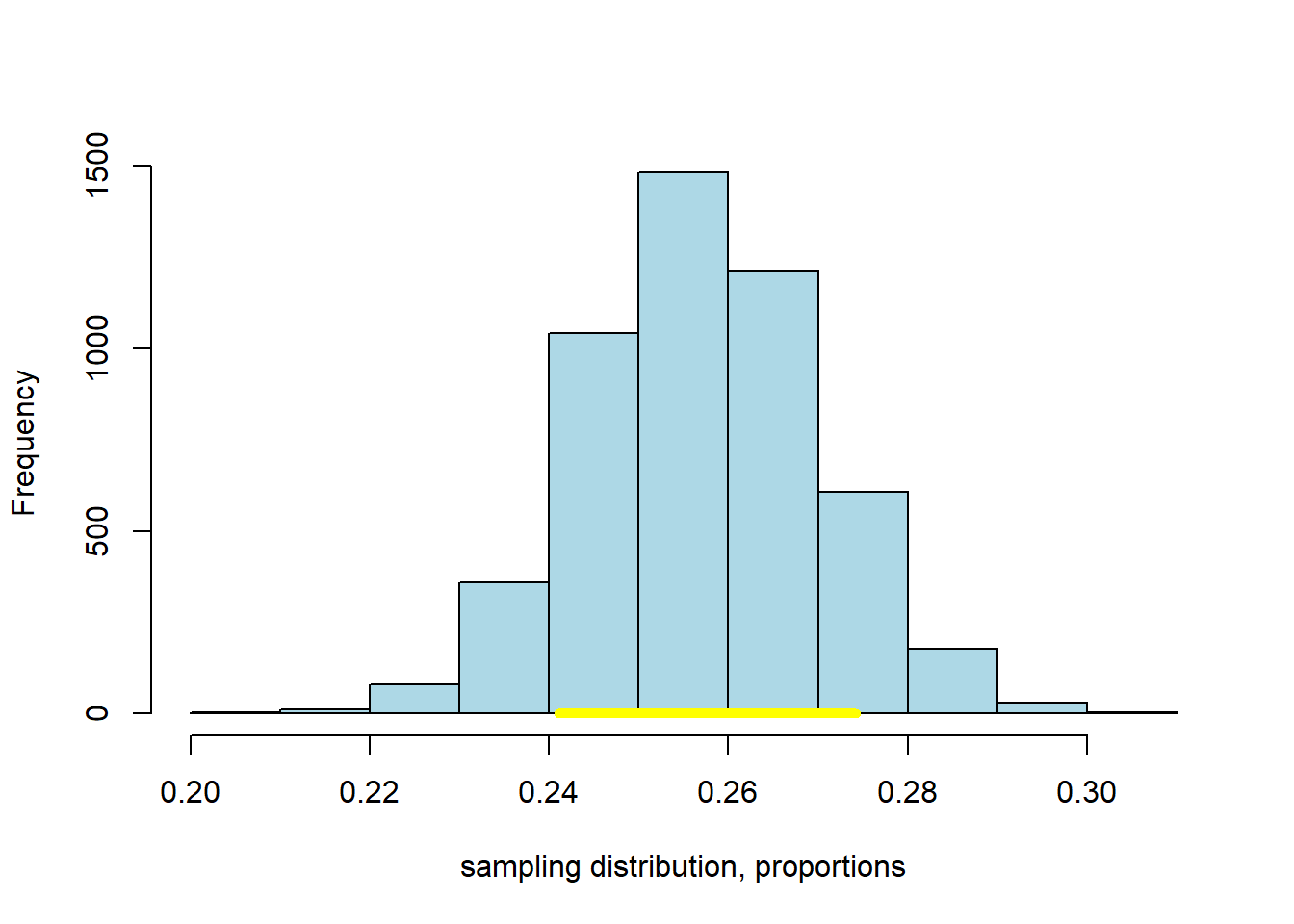 We use the term “estimate”, because we will never know the value of the population parameter for sure. But it is reasonable that we try to say how uncertain we are about our estimate. More crudely, we want to know how much “error” we have around our estimate; intuitively, if we rely on the statistic from the sample we drew, how wrong are we likely to be in terms of understanding of the “true” value the parameter takes in the population?