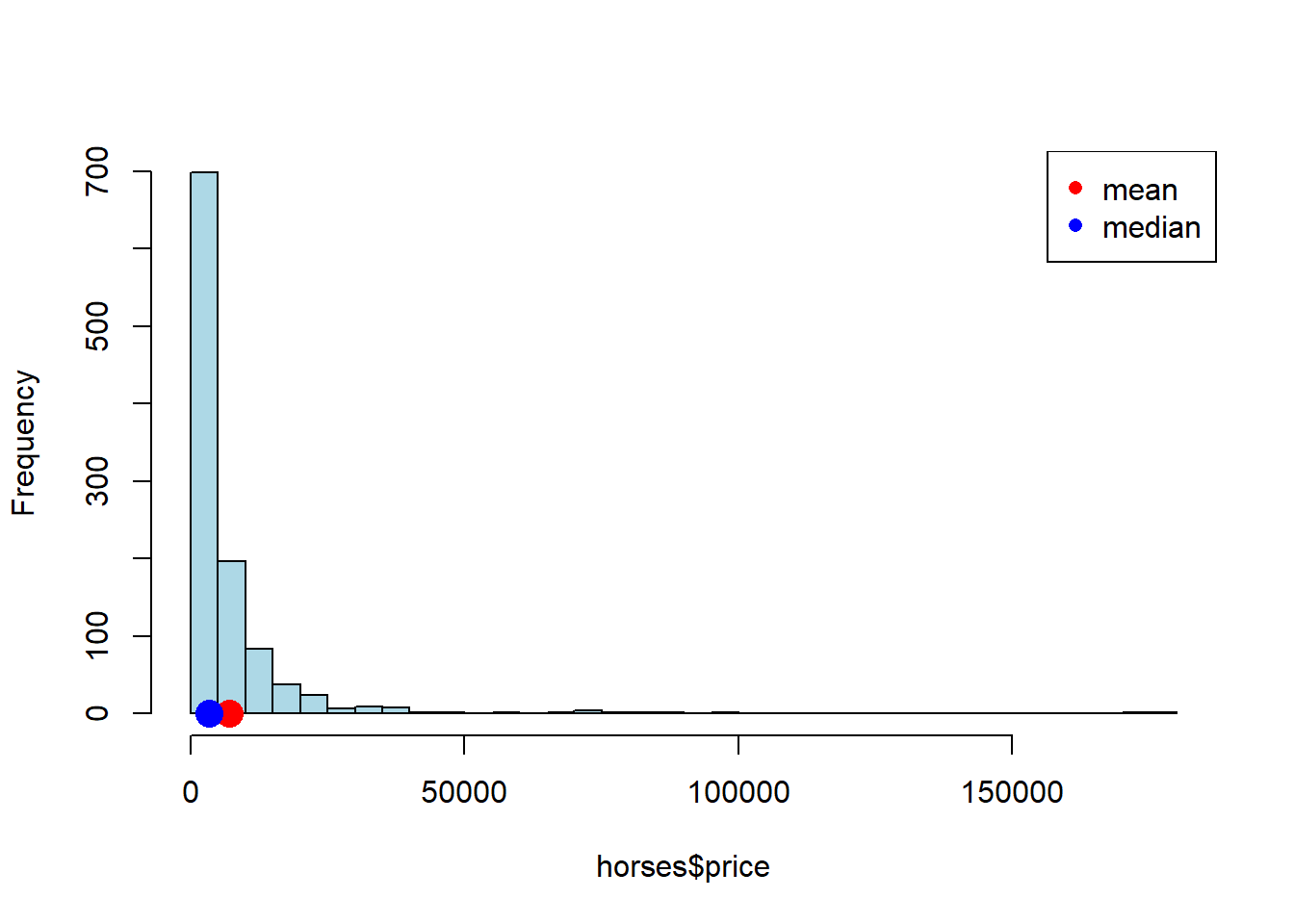 We begin with a data set on a population that is certainly not normally distributed. In particular, the prices of horses for sale online (via a specific website). As we can see, prices start as low as zero but can go very high: it’s a right skewed distribution, with a mean considerably higher than its median.
