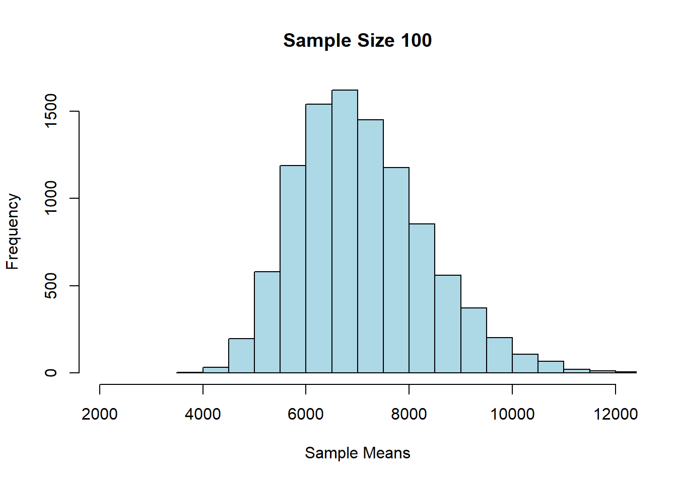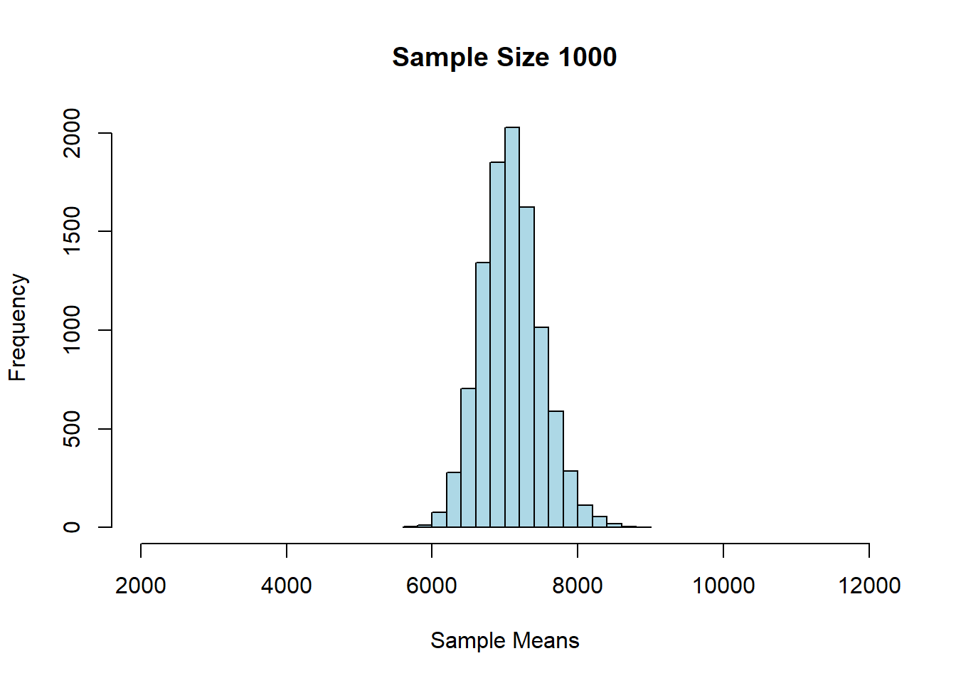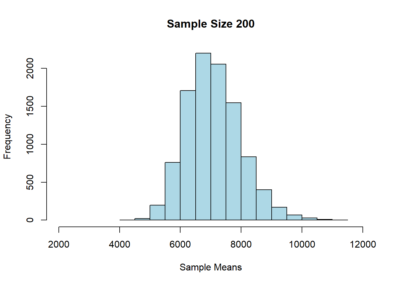 Finally, notice that as the sample sizes got larger, the standard deviation of the sampling distributions got smaller: it started out about 1300 (\(n=100\)), then fell to about 900 (\(n=200\)), and then to about 400 (\(n=1000\)). A smaller standard deviation is good, because it implies that our estimate is on average closer to the truth (the population mean). Again, this makes sense given what we know about larger samples.