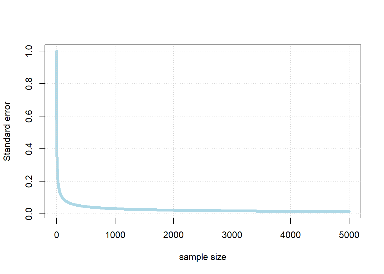So, the standard error falls very quickly at first as the sample gets larger. But eventually, it begins to flatten off: it still continues to fall every time the sample increases, but the effect is not linear. For example, if we multiple the sample by ten, we will not be able to decrease the standard error by ten.