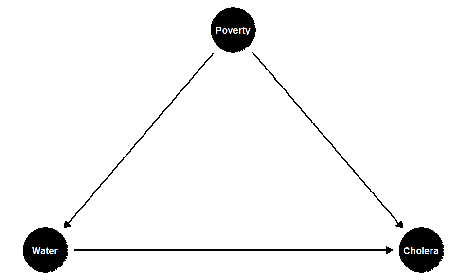 Let’s return to our Snow example, and again suppose he compares a sample of treated units (received the contaminated water) with a sample of untreated ones (had clean water) in terms of their outcome (cholera rates). Suppose also that we think pre-existing poverty and ill-health is a plausible confounder. That is, we think that if you are poor, you are more likely to end up in an area with bad water, and more likely to get cholera anyway.